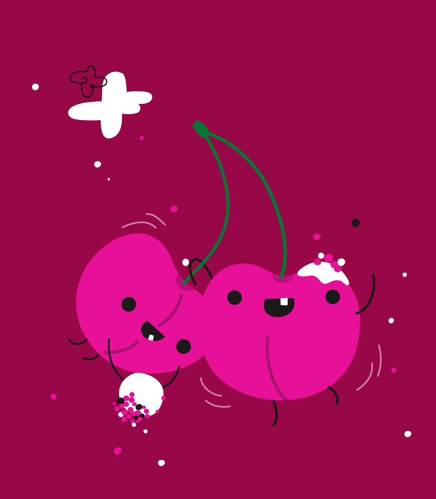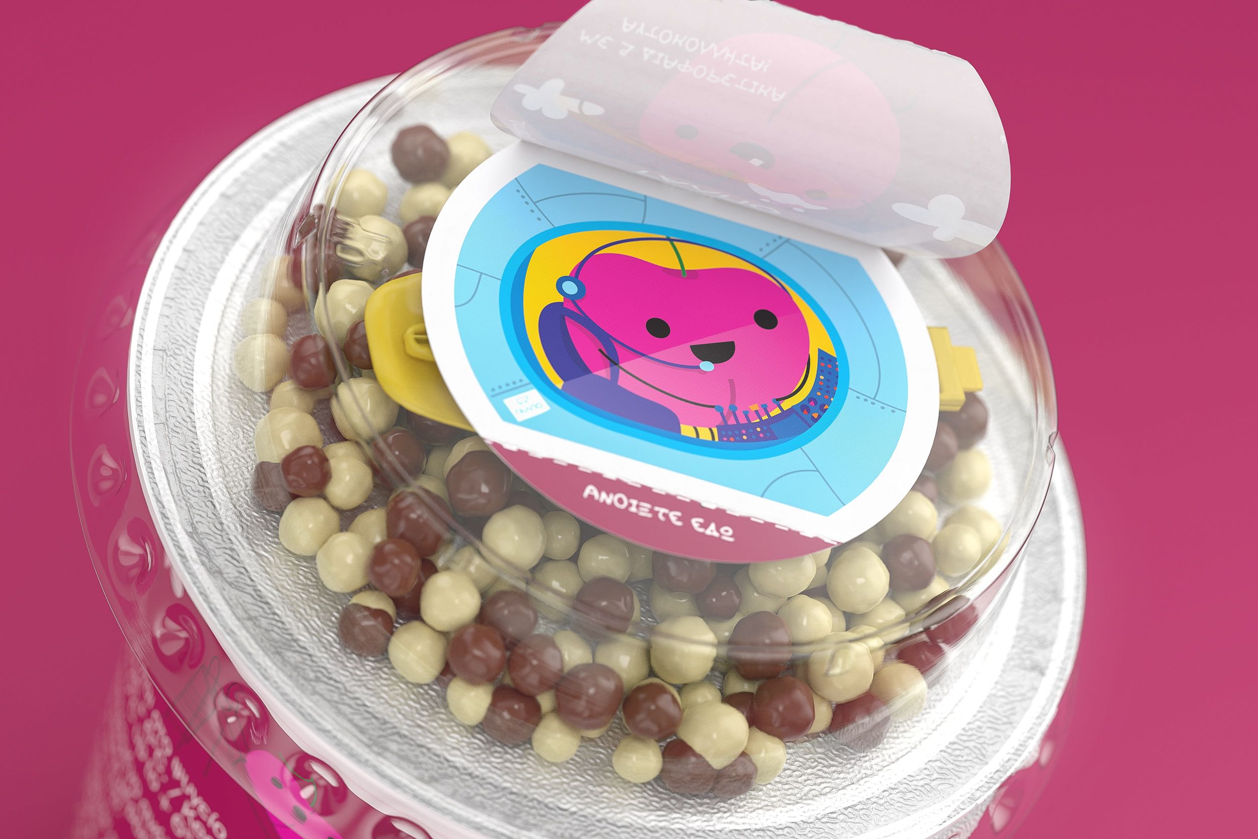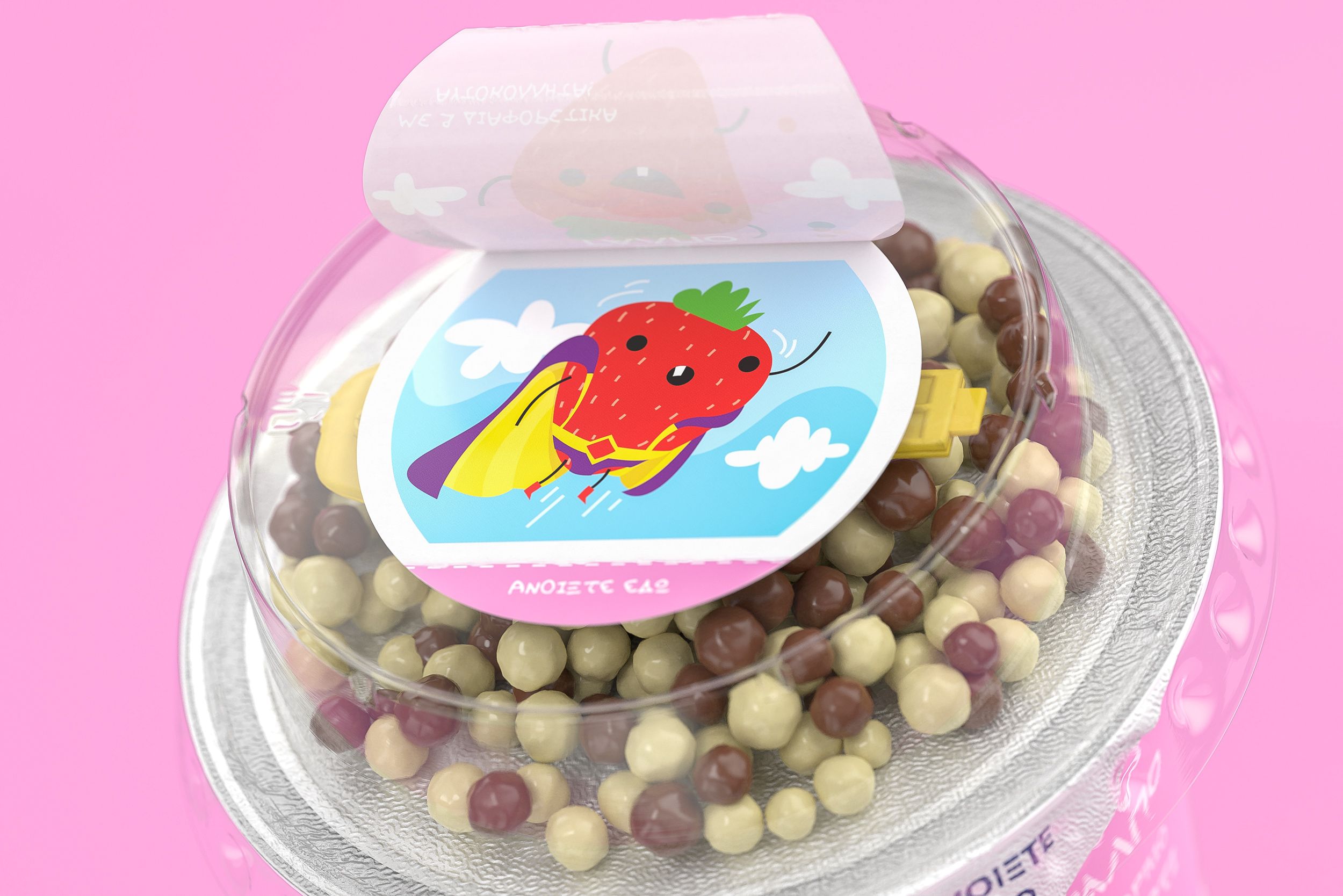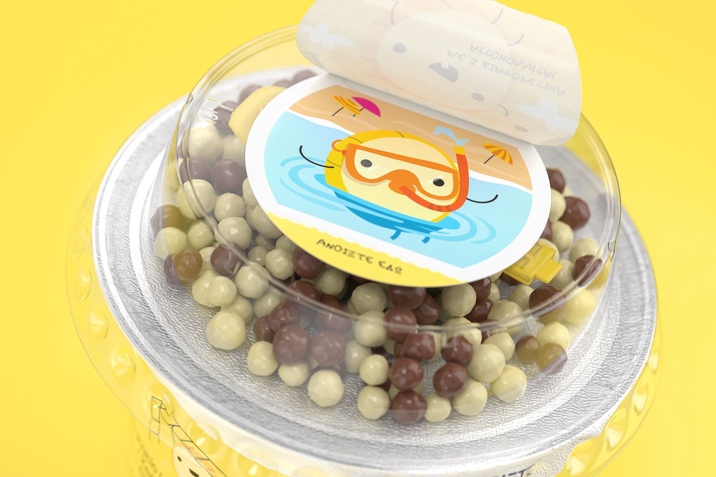 We created a friendly, colorful series of stories, where fruits come to life and become cute little cartoon characters, playing around or doing fun things. Beyond the cartoon characters, each illustration depicts the product components: yogurt with crispy balls made of cereal and milk chocolate. The characters on the packs interact with the product and the components literally become part of the whole scenery. These little stories add a surrealistic element, so the visual metaphors aim to grasp the kids’ attention and transform a nutritional food into a daily fun game.