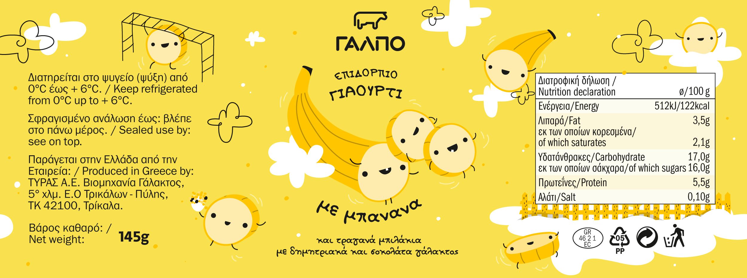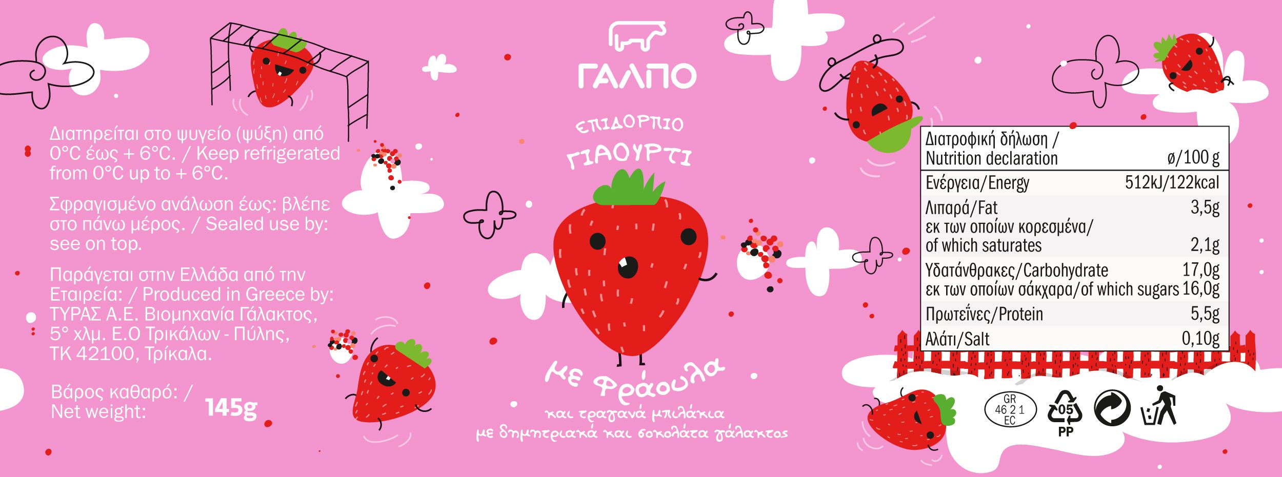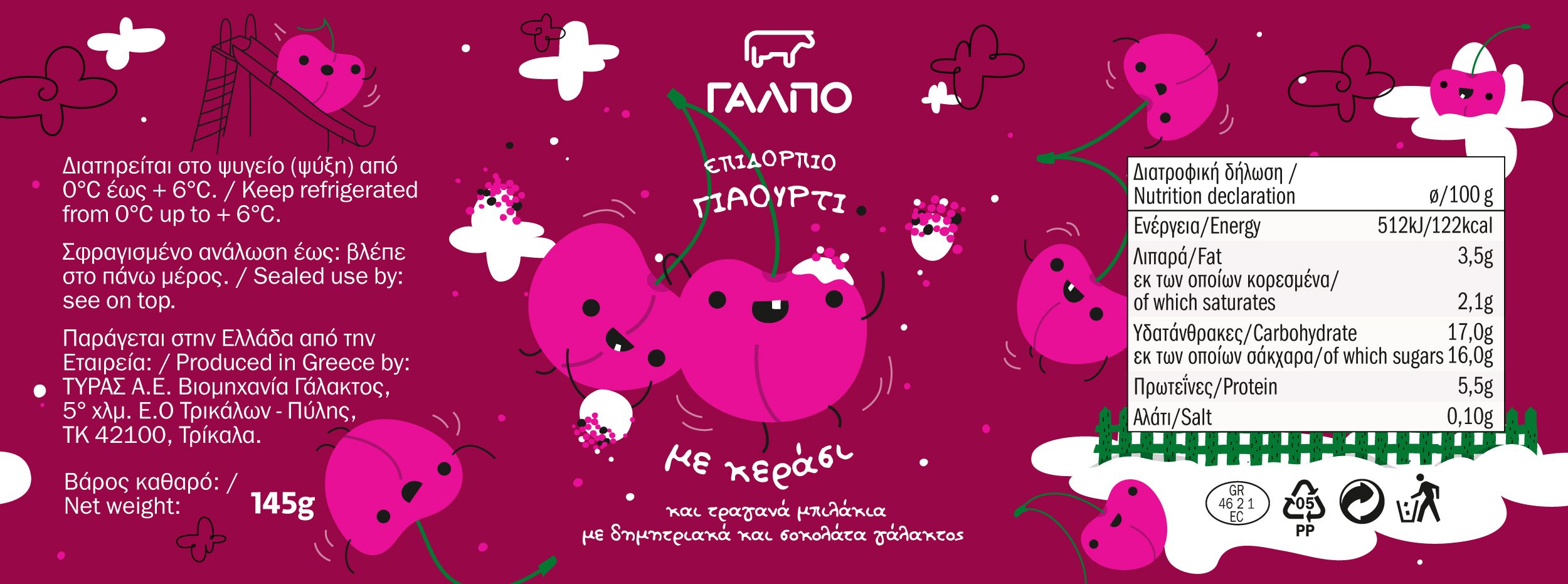 We worked on a series of kids’ fruit-flavored yogurts for Lidl Hellas. The brand name is GALPO (ΓΑΛΠΟ) and the products are sold through the Lidl supermarket chain across Greece.