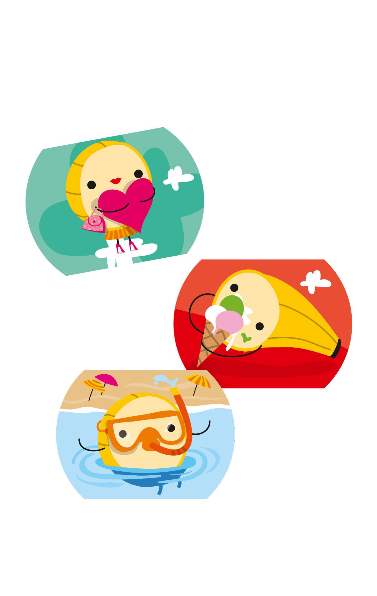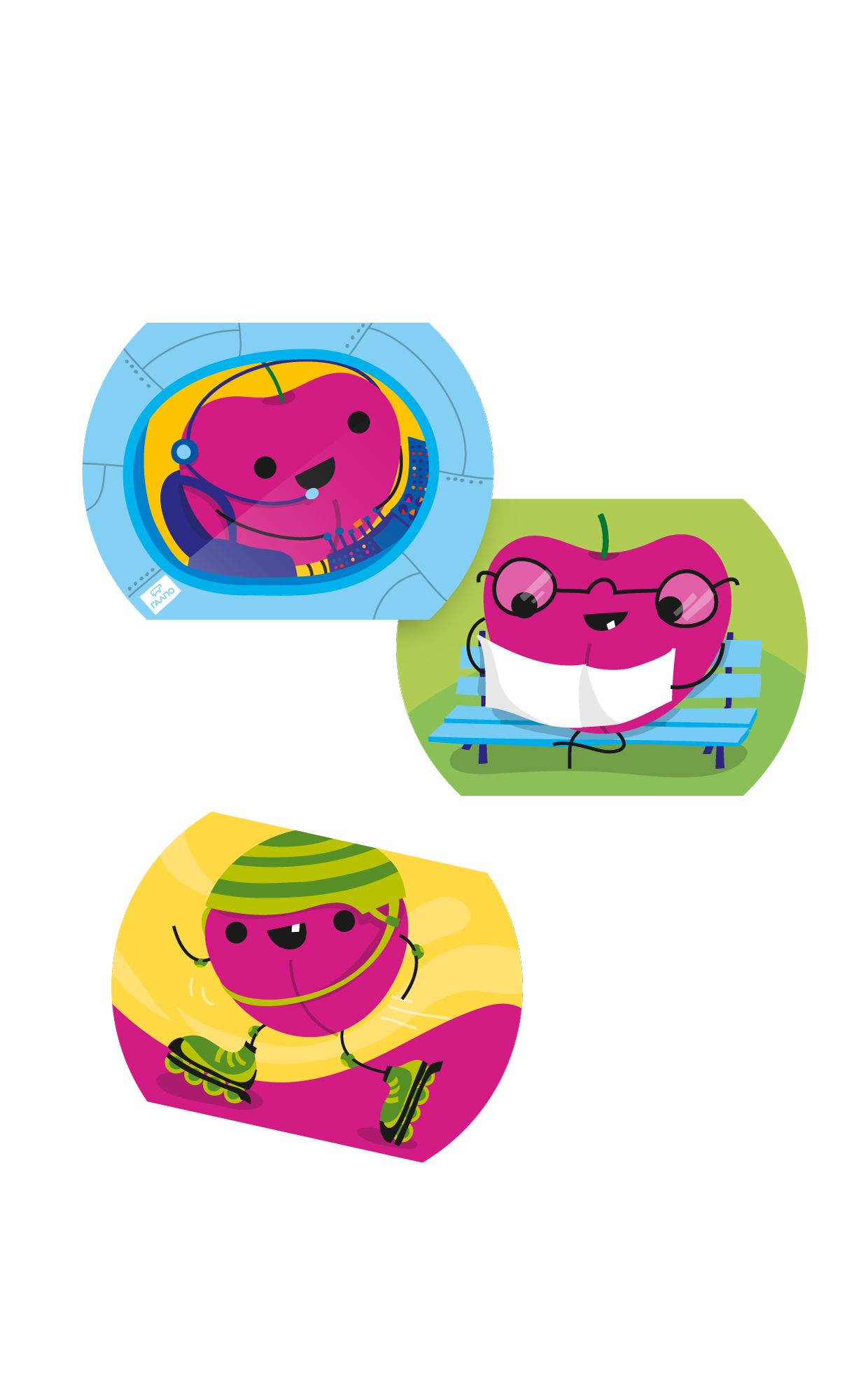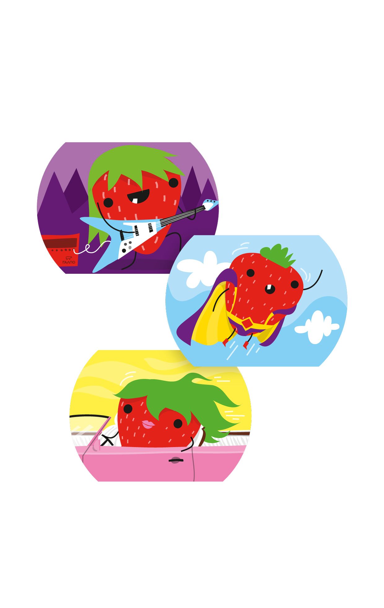 We used the illustrations to design the packaging and the little stickers that kids can find on top of each plastic cap, as a surprise gift. On each sticker there is a different fruit character on a different adventure, so the stickers can become collectible. The complete dairy product range was designed by the mousegraphics studio. We worked with mousegraphics to develop the packaging in three main flavors: strawberry, banana and cherry.