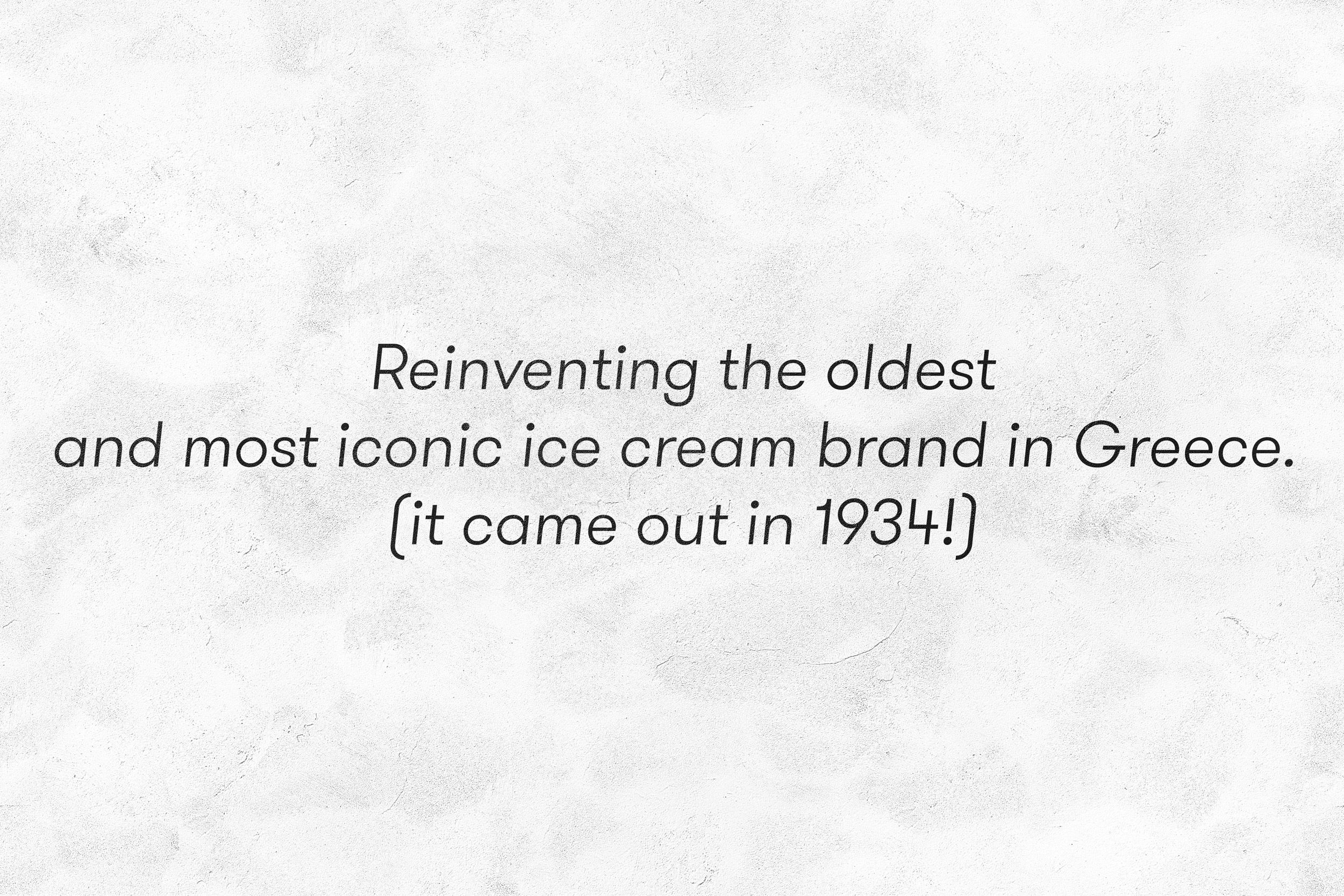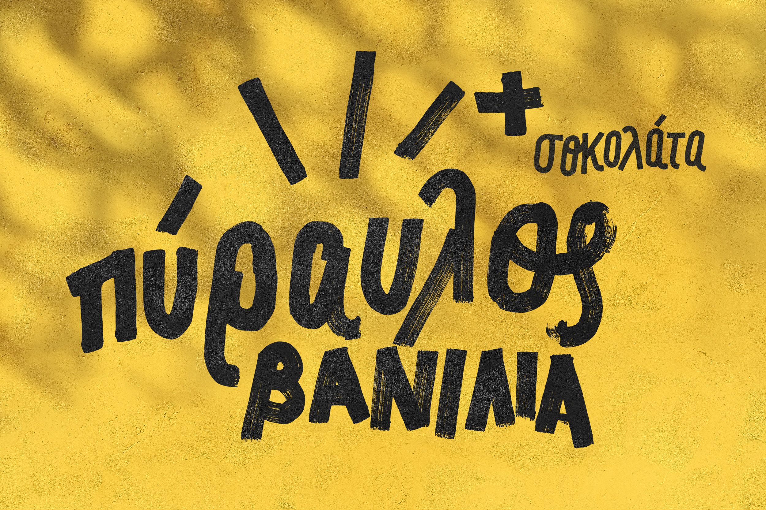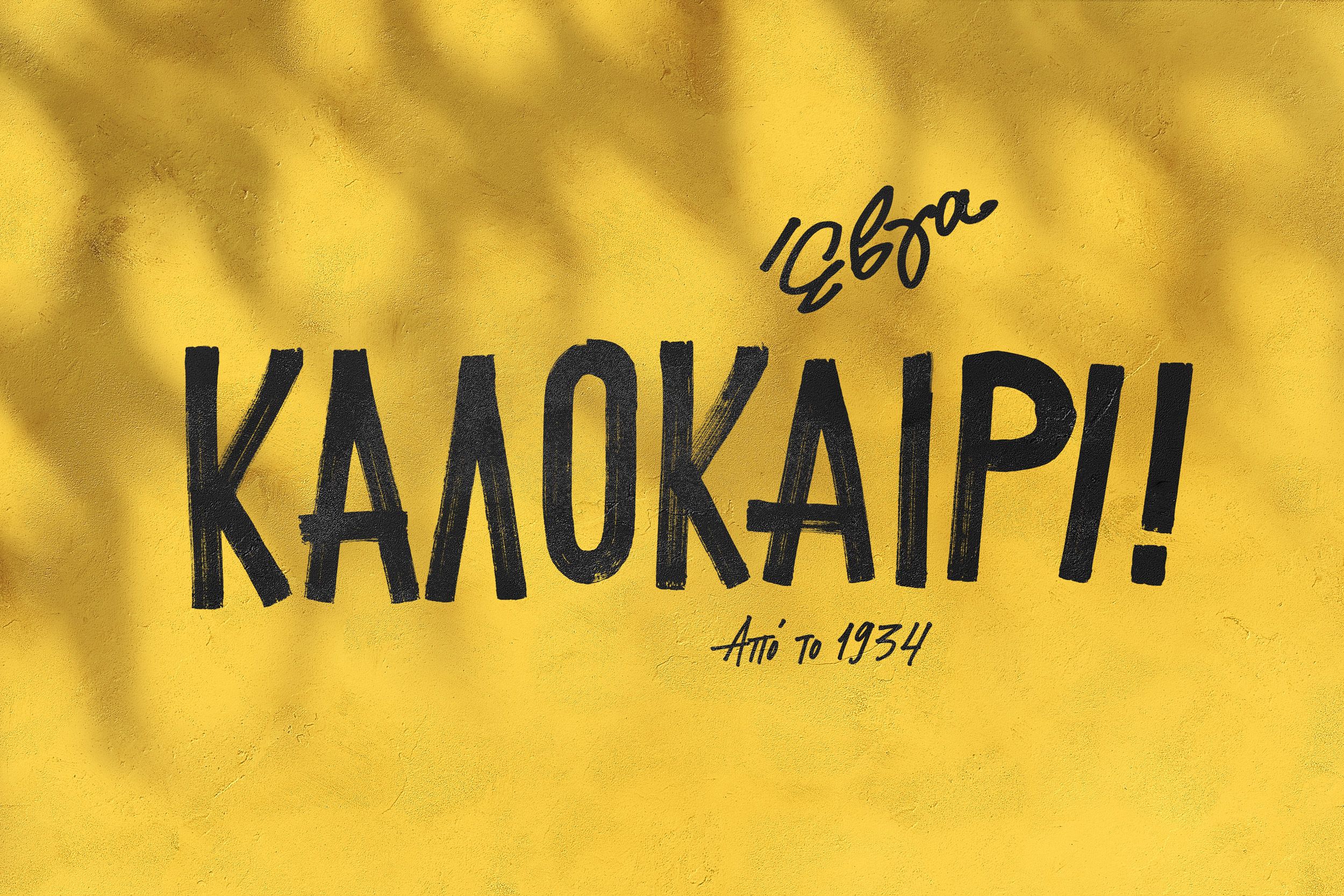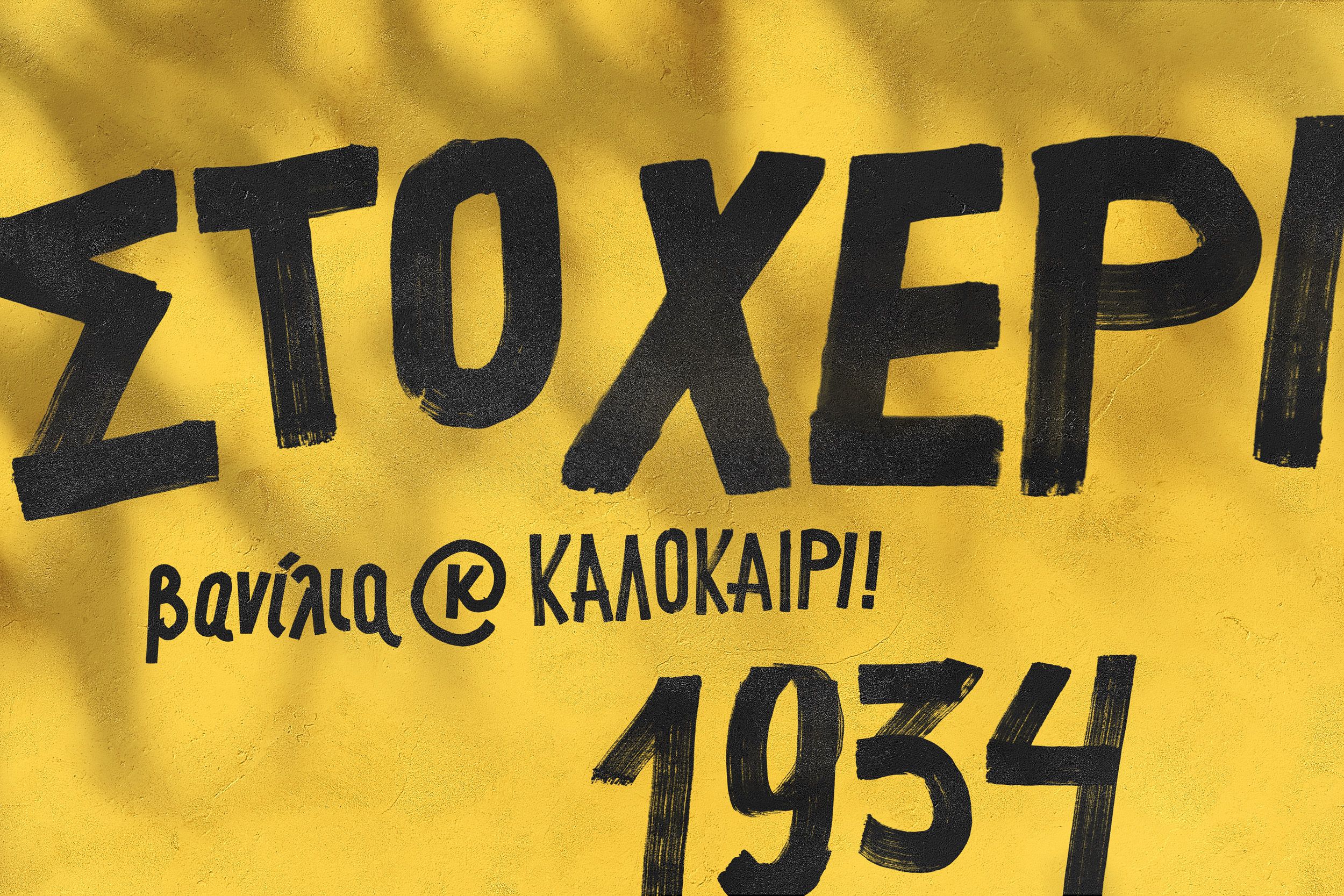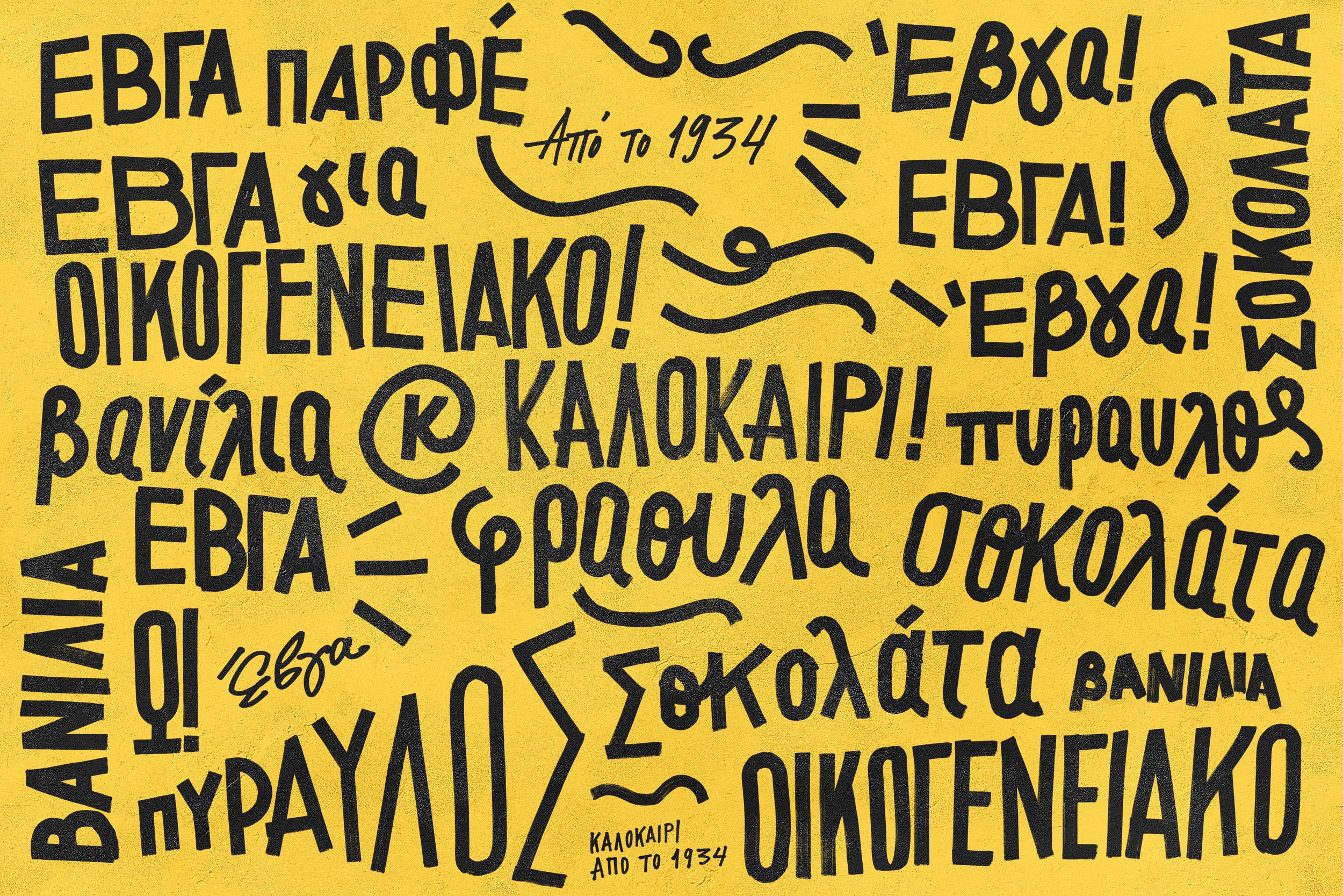 The 1930s, the decade that EVGA ice creams came out, was a time of severe economic struggle for Greeks. [If something could be hand made...it would be. No money for designers back in the day.] Our tailor-made letterings were inspired by the large D.I.Y. signs that convenience-store owners used to paint with thick paintbrushes at the front of their establishments. The designs were simple & honest, with imperfections that added a light-hearted and friendly character to them.