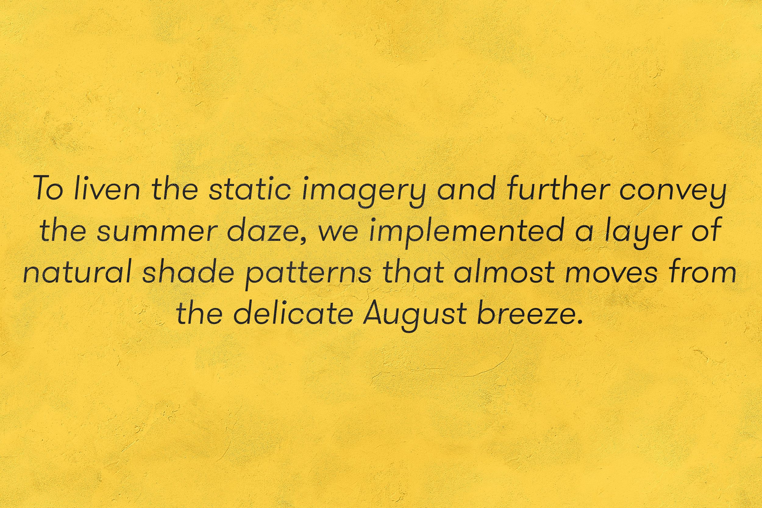 To close the gap between memory and reality, we borrowed textures and materials from the traditional architecture of the Greek islands. These styles have survived through time and are predominant in summer destinations even today. To liven the static imagery and further convey the summer daze, we implemented a layer of natural shade patterns that almost moves from the delicate August breeze.