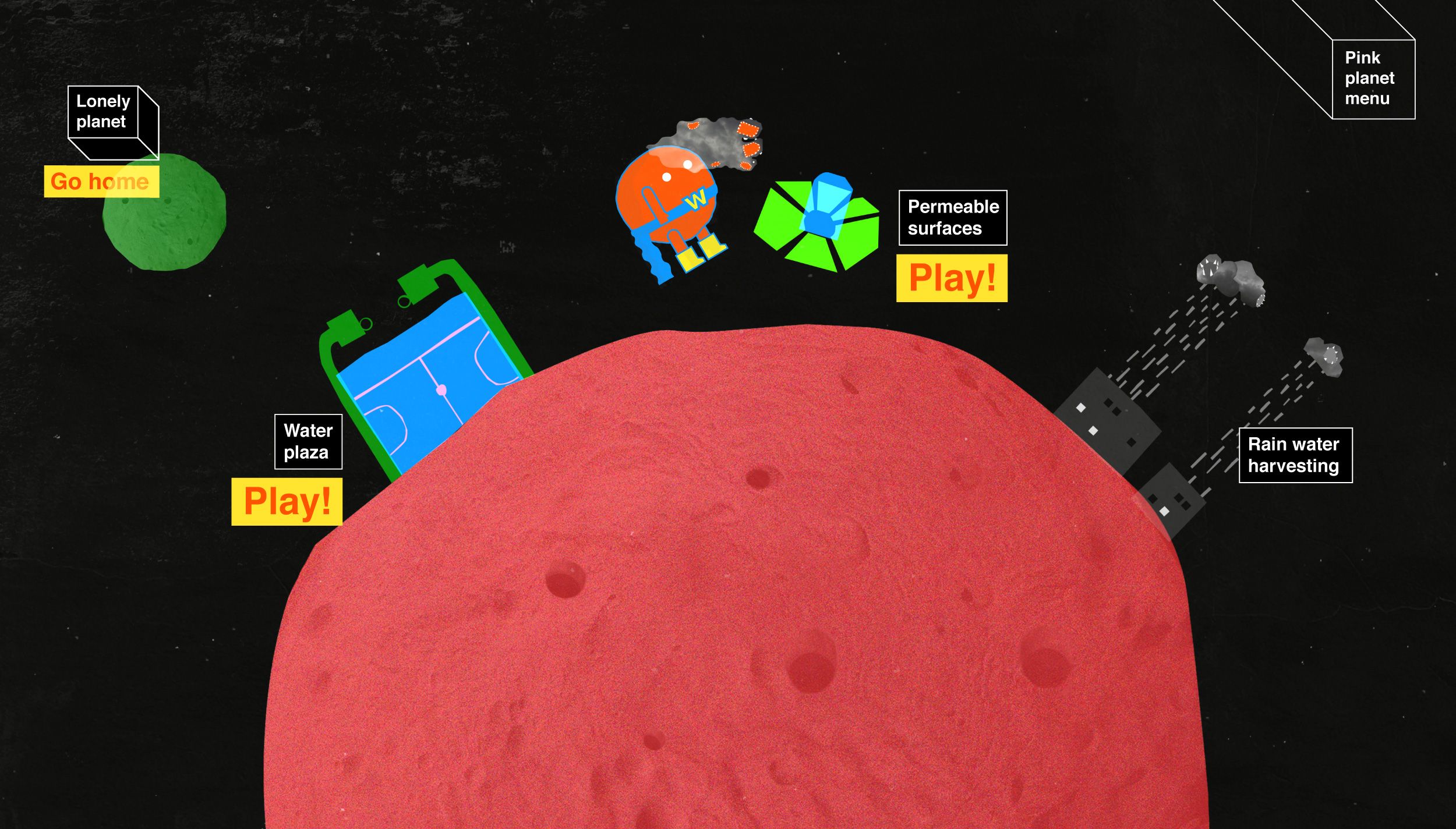 After the completion of the Lonely planet stages, the Water Hero is called to help the Pink planet where according to the story the ‘Bad weather’ is threatening the city. This part presents the water saving practices in a complicated city environment. Following the same gameplay after the explanatory video, the player is called to solve problems and help the city maintain its water-saving facilities. These stages introduce non-conventional water facilities used in a city like water plaza and rainwater harvesting methods. After the successful completion of each stage, a video showcases the result of the achievement and explains further each facility.